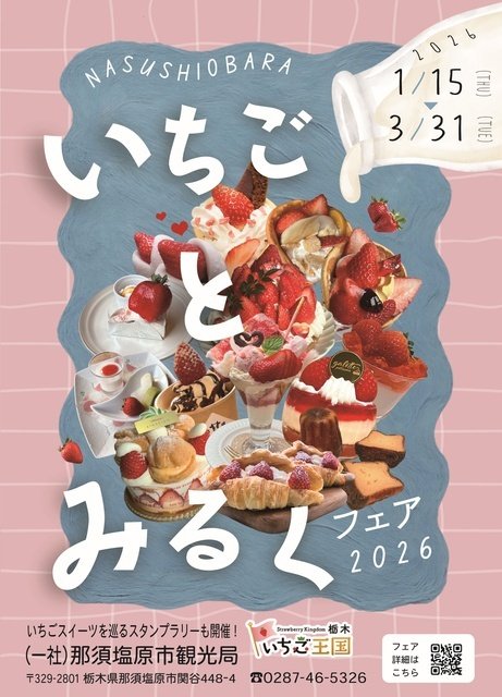 スタンプラリーで巡る、おいしいスイーツと冬の那須塩原。美味しいいちごと新鮮なミルクで作った、お宿自慢のスイーツを泊まって食べて! お店一押しのスイーツを行って食べて! 那須塩原市内を美味しく巡ろう。スタンプを3つ集めるとオリジナルグッズや豪華賞品が当たる抽選に応募できる。