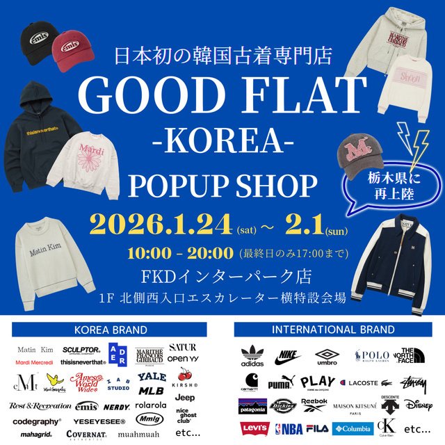 韓国現地でしか手に入らないレアブランドから、日本ではまだ流通の少ない注目ブランドまで日本の最新ファッショントレンドと掛け合わせた、日本初の韓国古着専門店『GOODFLAT-KOREA-』が栃木県に再上陸。1会場あたり5,000点以上の豊富なアイテム数を誇り、期間中はユニセックスアイテムを中心に新作商品を随時追加。性別・世代問わず訪れるたびに新しい出会いが楽しめる空間を提供する。