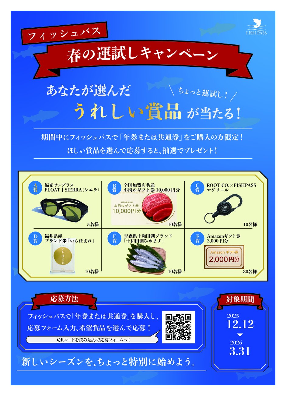 2025年12月1日(月)〜2026年3月31日(火)にフィッシュパスで購入した「年券」および「共通券」※「日券」は対象外です。