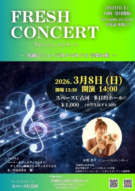 古河市出身のミュージカルシンガーを迎え開催される。誰もが聴いたことのある名曲の数々をミユージカルに演出した音楽の旅を楽しもう。申し込み受付開始は2月21日(土)10時より電話または来館にて。