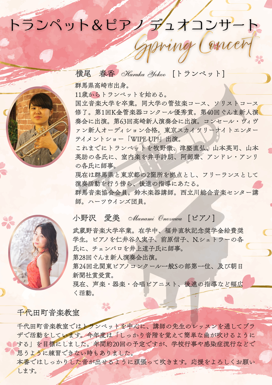 トランペット奏者の横尾春香さんとピアニストの小野沢愛美さんによるロビーコンサートを開催します。