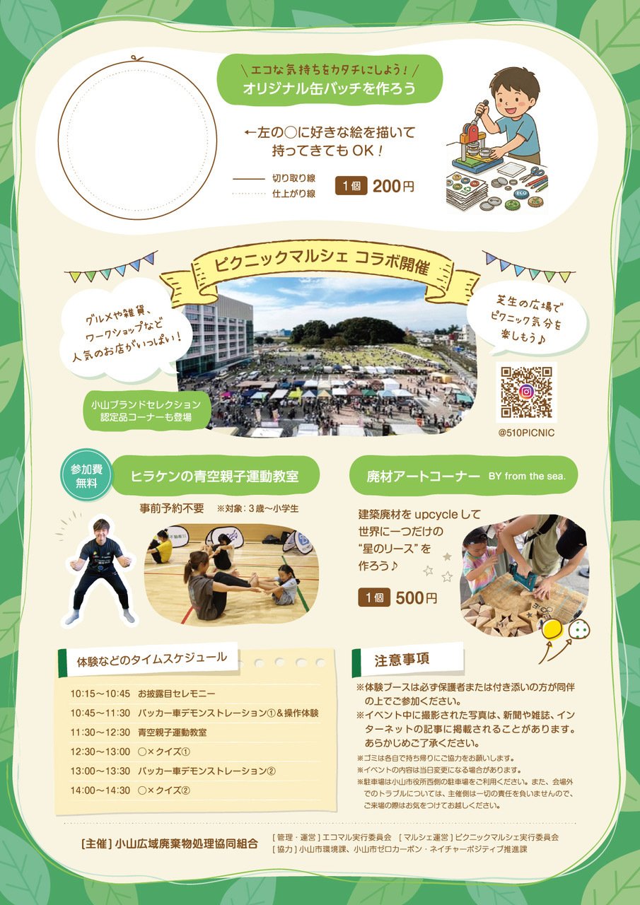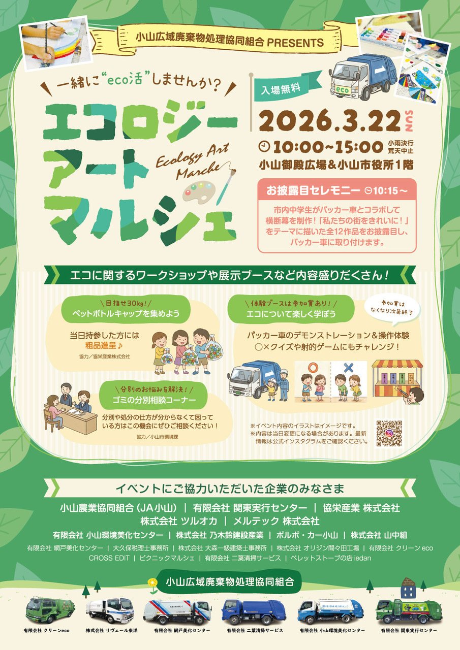 自分たちが住む地域のゴミ処理や環境美化について考え、小山市が進める「ゼロカーボンシティ&ネイチャーポジティブ宣言」の実動的なイベントとして、「エコロジーアートマルシェ」を初開催します。