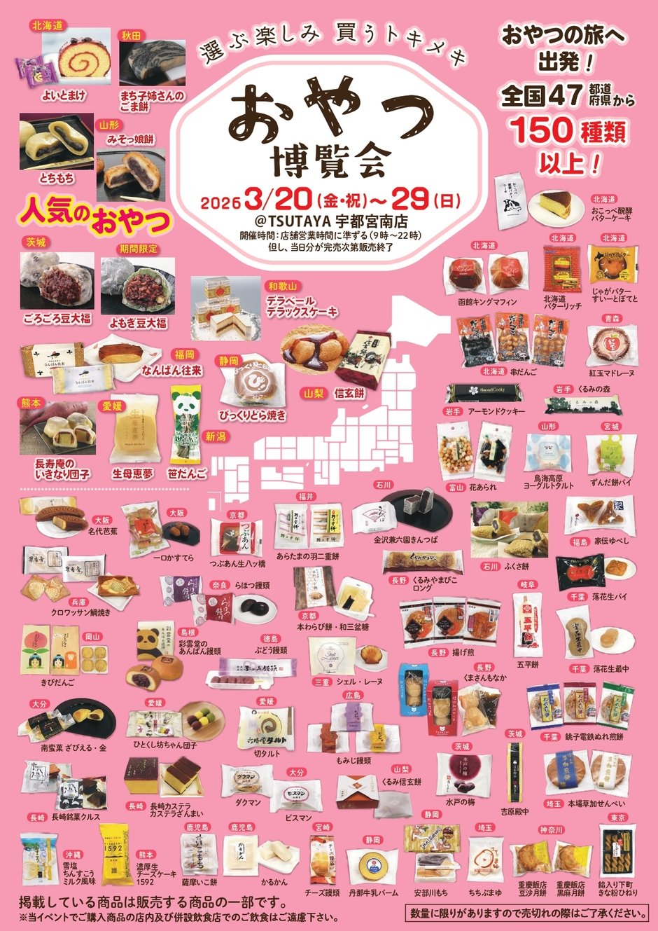 カルチュア・エクスペリエンス株式会社(本社:東京都千代田区)は、全国のご当地おやつを集めたイベント『おやつ博覧会』を各地で開催しています。2026年3月は、「幕張 蔦屋書店」(千葉県千葉市)、「TSUTAYA いまじん白揚ウイングタウン岡崎店」(愛知県岡崎市)、「TSUTAYA いまじん白揚鈴鹿中央通店」(三重県鈴鹿市)、「TSUTAYA BOOKSTORE カラフルタウン岐阜」(岐阜県岐阜市)、「TSUTAYA いまじん白揚ミタス伊勢店」(三重県伊勢市)、「TSUTAYA いまじん白揚春日井店」(愛知県春日井市)、「TSUTAYA 宇都宮南店」(栃木県宇都宮市)で、3月4日(水)より順次開催いたします。
