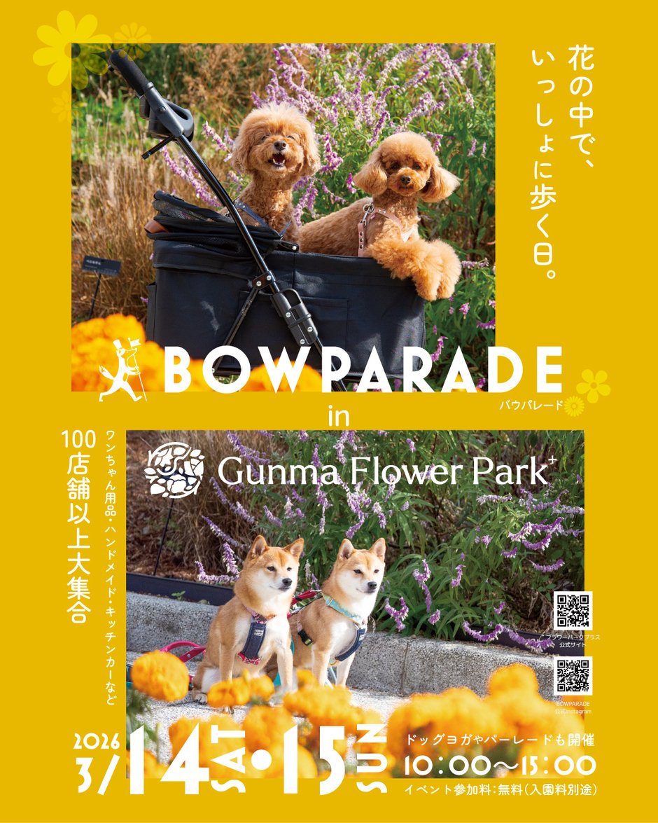2025年秋に「Enjoy!花とあそぶ」をコンセプトにリニューアルした「ぐんまフラワーパークプラス」では、2026年3月14日(土)・15日(日)の2日間、ワンちゃんと飼い主様が主役の大型イベント「BOW PARADE(バウパレード)」を初開催いたします。
