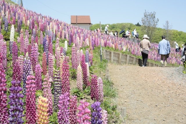 ルピナスは南アメリカや地中海原産のマメ科の植物で、花色もピンク・オレンジ・白・黄色・青等バリエーション豊富で、藤の花を逆さまにしたように空に向かって咲くさまから「ノボリフジ」と呼ばれている。本来多年草ですが、本州では夏の暑さを超えられないため毎年苗を植えている。約3万本のルピナスがみられるのは、全国でも有数の規模だ。