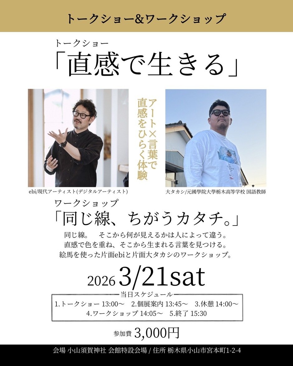 栃木県小山市にある長い歴史を刻んできた、由緒ある神社「須賀神社」での、デジタルアーティスト ebi の個展開催に際し特別企画として開催する、トークショー&ワークショップです。