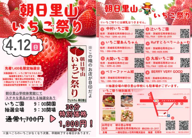 開催日時備考:食べごろのいちごが無くなった際は、早期終了の場合あり。いちご園:9時開園 (対象農園:中村いちご園、辻いちご園、いちご屋あんちゃん、Rafすとろべりーふぁーむ、大関いちご園、丸坂いちご園、ベリーファーム結、BERRY VERY GOOD)、抽選会場:9時30分開場(朝日里山学校体育館)