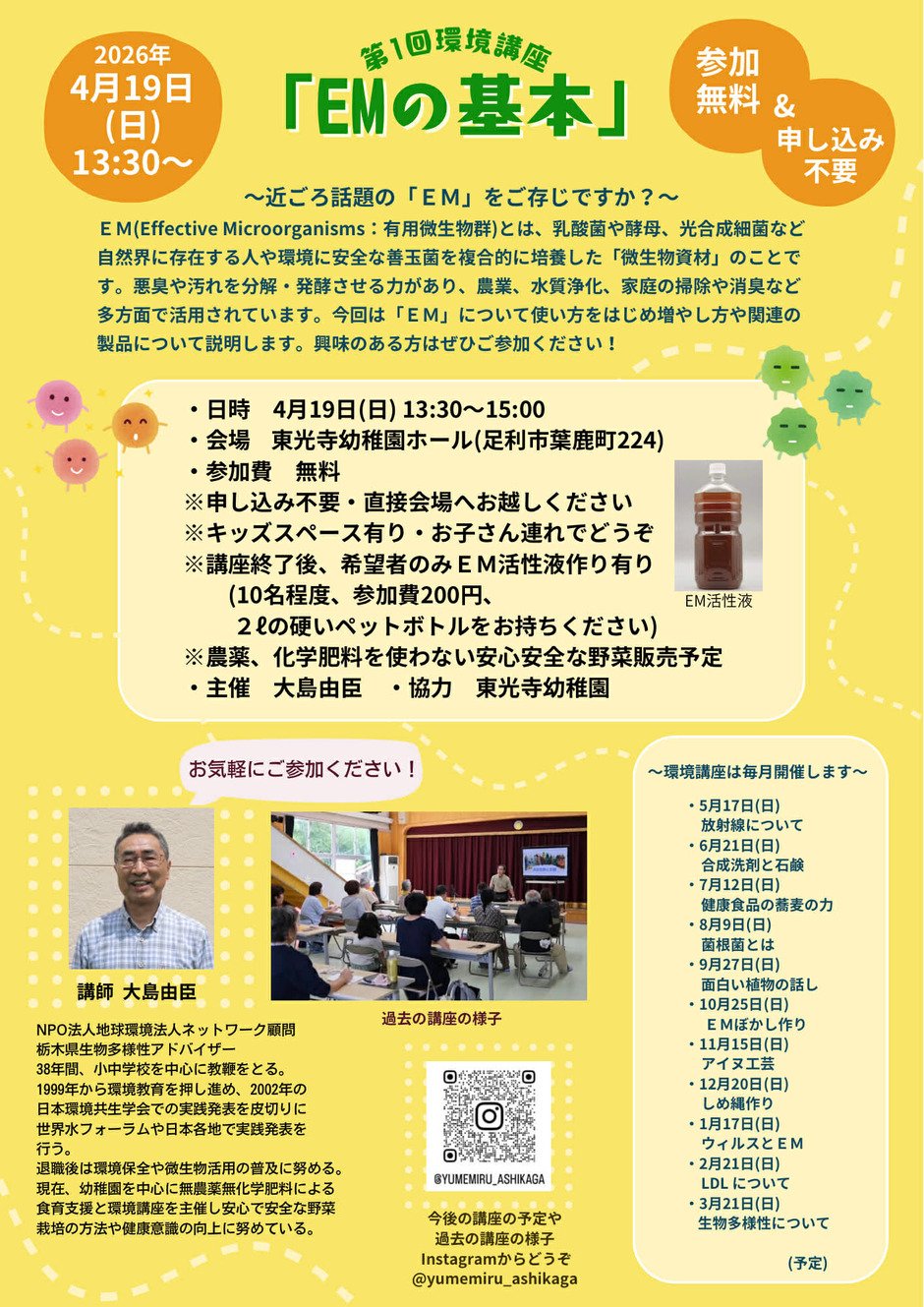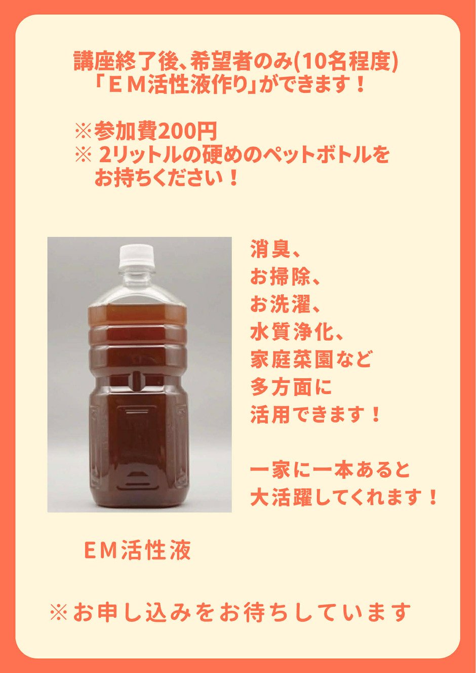 悪臭や汚れを分解・発酵させる力があり、農業、水質浄化、家庭の掃除や消臭など多方面で活用されます。今回は「EM」について使い方をはじめ増やし方や関連の製品について説明します。興味のある方はぜひご参加ください!