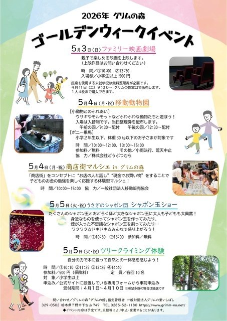 ゴールデンウィークに合わせて親子で楽しめるイベントを開催する。3日は人気アニメ映画を上映する「ファミリー映画劇場」、4日は小動物とのふれあいとポニー乗馬が楽しめる「移動動物園」と「商店街マルシェ」、5日はうさぎのシャボン団による「シャボン玉ショー」と「ツリークライミング体験会」を開催。映画劇場は小学生以上有料。ツリークライミングは事前の申し込みが必要。