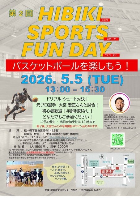 5月5日こどもの日に家族皆で楽しめるイベントだ。年長さんから高齢者まで、年齢制限なし。家族みんなで参加して、体を動かすことバスケットボールの楽しさを体験してみてはいかが?もちろん、ひとりでの参加もOK。仏様が鎮座されている珍しいアリーナで元プロバスケット選手大宮宏政氏がコーチングを行う。昨年のイベントは大好評!!みんなで、楽しく汗をかこう。