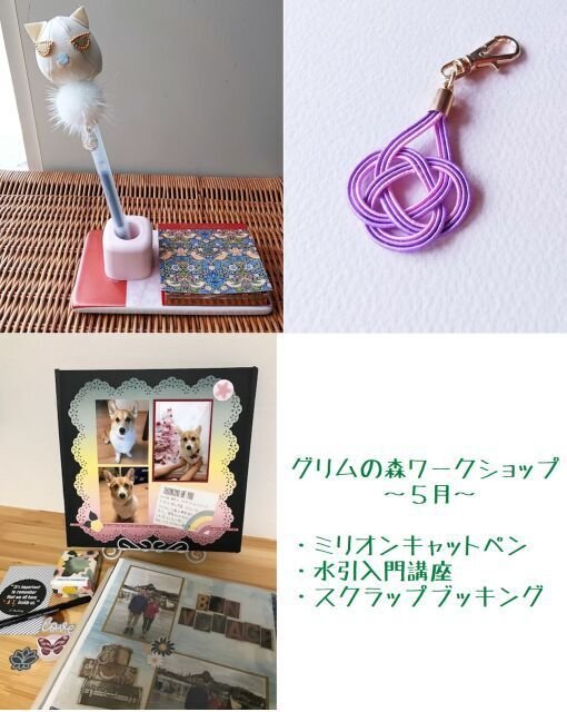 写真をオシャレに飾ってオリジナルのアルバムを作る「スクラップブッキング」、人気のキャットドールで作る「ミリオンキャットペン」、日本の伝統素材をカジュアルに楽しむ「水引入門講座」の3つの講座が行われる。