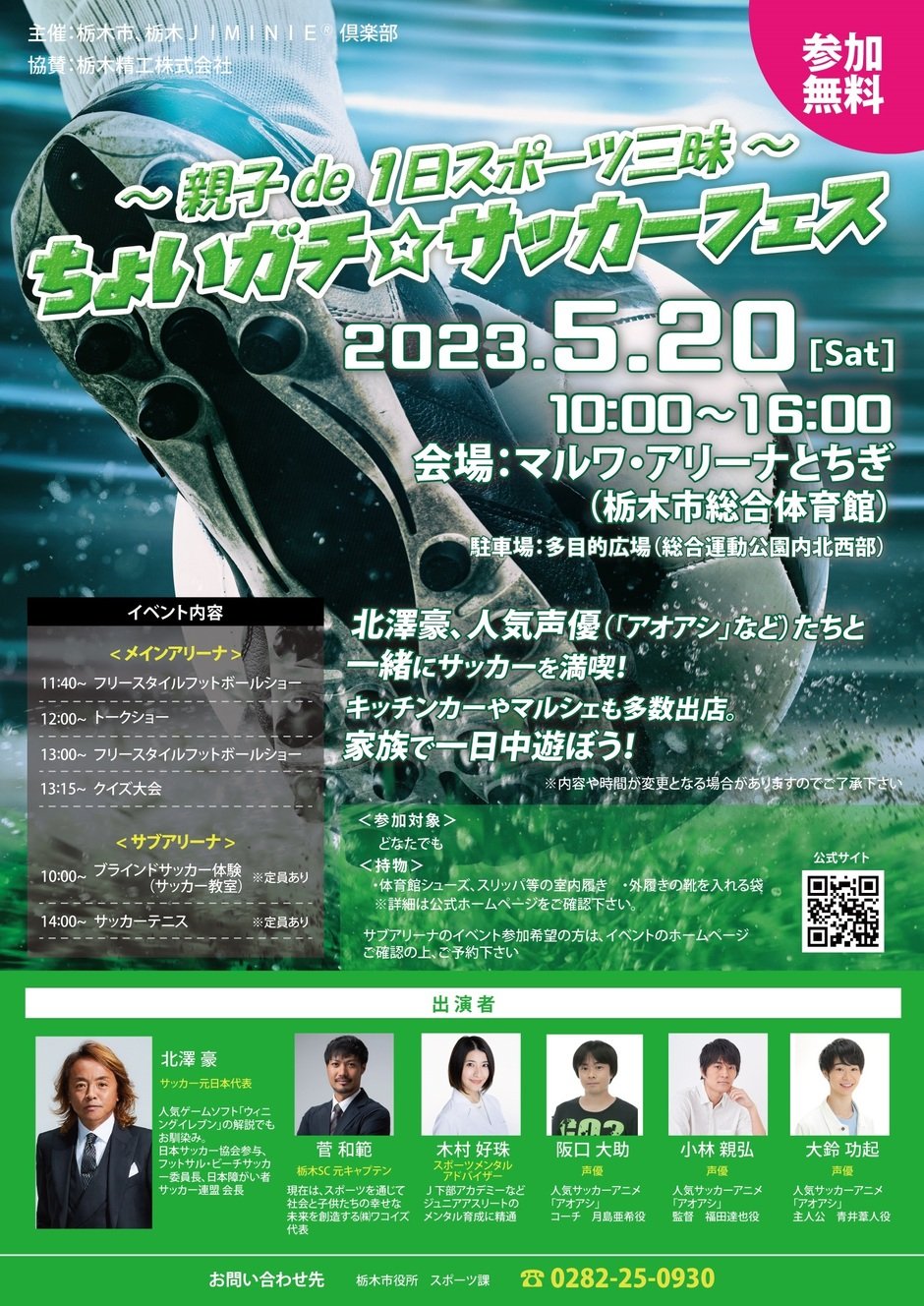 サッカー元日本代表北澤豪さんなどの豪華出演者によるトークショーをはじめ、元Jリーガーと対決できるサッカーテニスや豪華賞品が当たるクイズ大会、さらには多くのキッチンカーやマルシェの出店など、内容盛りだくさんのサッカーイベントです。