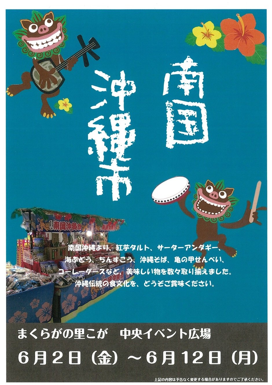 南国沖縄より、紅芋タルト、サーターアンダギー、海ぶどう、ちんすこう、沖縄そば、亀の甲せんべい、コーレーグースなど、美味しい物を数々取り揃えました。