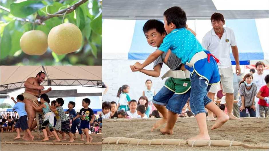 「どすこい」は相撲の掛け声、「ペア(PEAR)」は英語で梨の意味で、特産品である「梨」の収穫を祝って行われていた「梨相撲」にちなんだお祭りです。