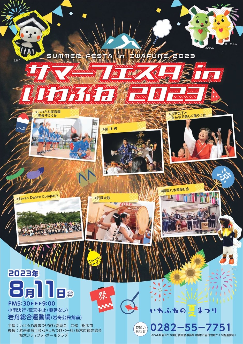 | お問い合わせ | 問合せ先:いわふね夏まつり実行委員会事務局(栃木市岩舟地域づくり推進課内) TEL:0282-55-7751 |