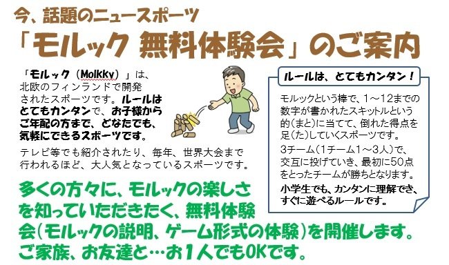 多くの方々にモルックの楽しさを知っていただきたく、無料体験会(モルックの説明、ゲーム形式の体験)を開催します。