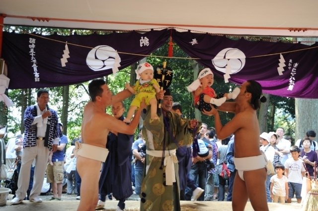 「泣く子は育つ」という縁起をかついだ習俗が奉納相撲に取り入れられた、全国的にも珍しい行事。国選択無形民俗文化財。