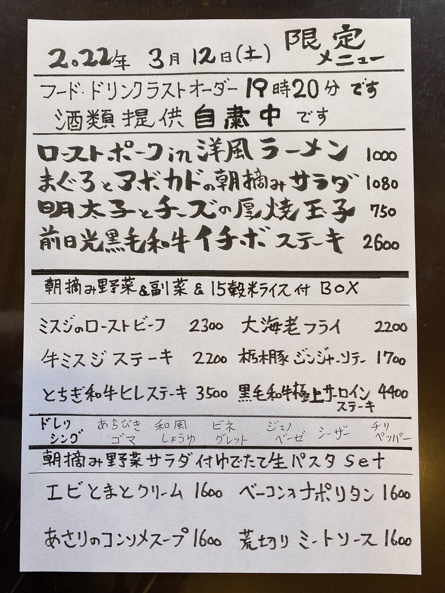 本日の限定 #テイクアウト メニューです。本日も #時短営業 19時20分 フードドリンクラストオーダー20時00分 クローズ...