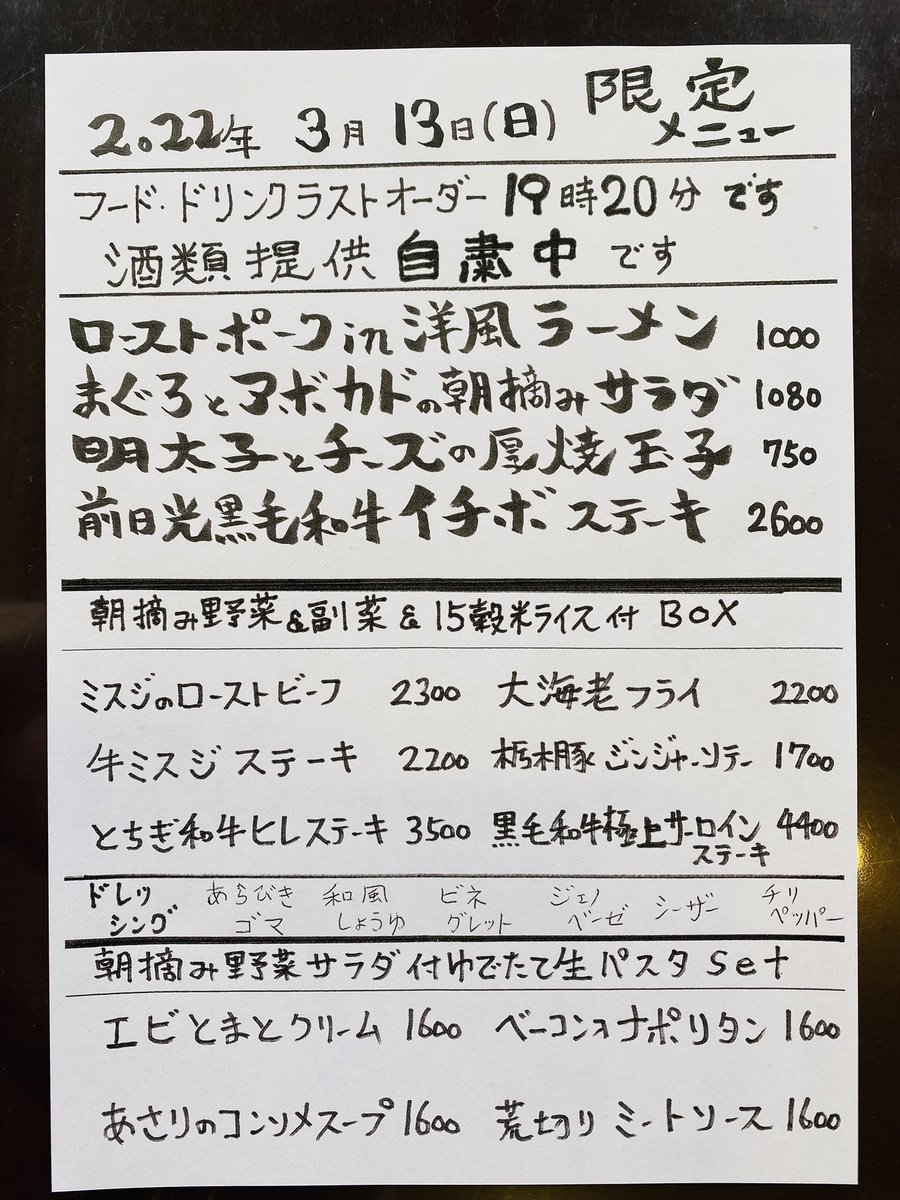 本日の限定 #テイクアウト メニューです。本日も #時短営業 19時20分 フードドリンクラストオーダー20時00分 クロー...
