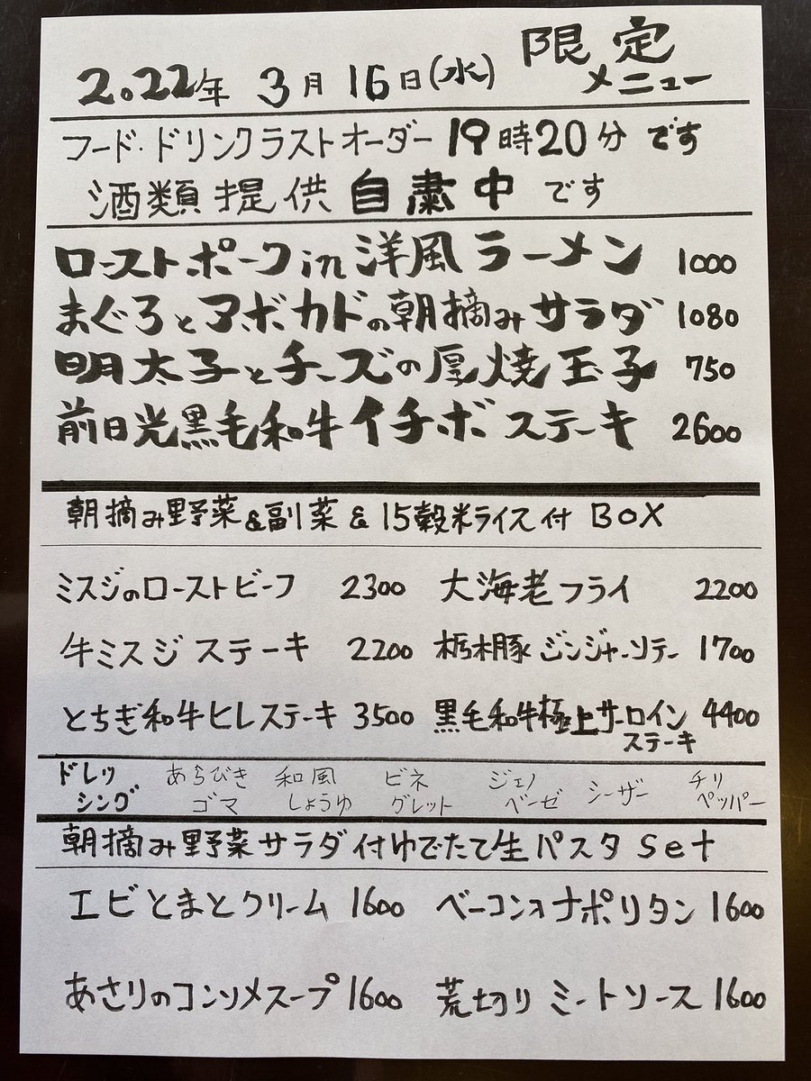 本日の限定 #テイクアウト メニューです。本日も #時短営業 19時20分 フードドリンクラストオーダー20時00分 クローズ...
