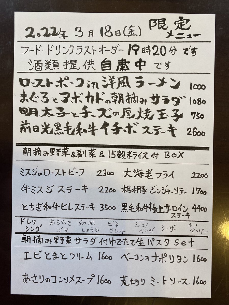 本日の限定 #テイクアウト メニューです。本日も #時短営業 19時20分 フードドリンクラストオーダー20時00分 クローズ...