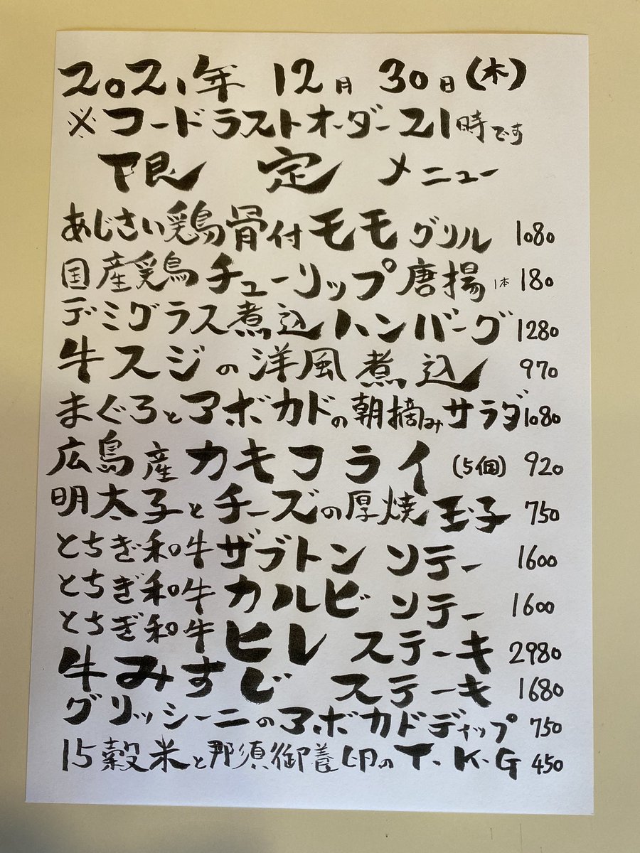 本日の限定& #テイクアウト メニューです。本日で、今年の通常最終です。明日は #カウントダウンパーティー のみで20時00分開店です🍴 #Gotoeat ご利用可能です❗️