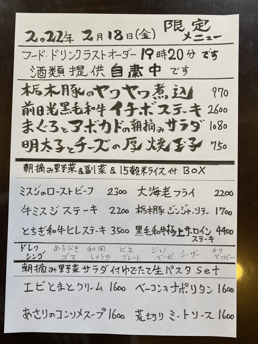 本日の限定 #テイクアウト メニューです。本日も #時短営業 19時20分 フードドリンクラストオーダー20時00分 クローズ...