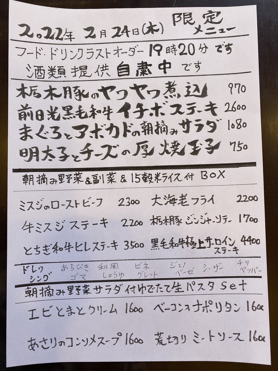 本日の限定 #テイクアウト メニューです。本日も #時短営業 19時20分 フードドリンクラストオーダー20時00分 クローズ...