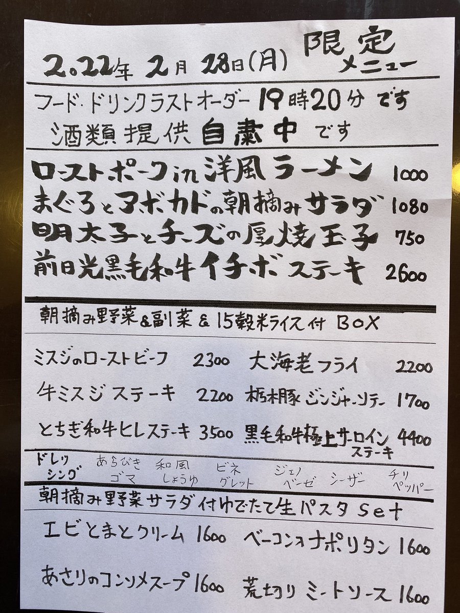 本日の限定 #テイクアウト メニューです。本日も #時短営業 19時20分 フードドリンクラストオーダー20時00分 クローズ...