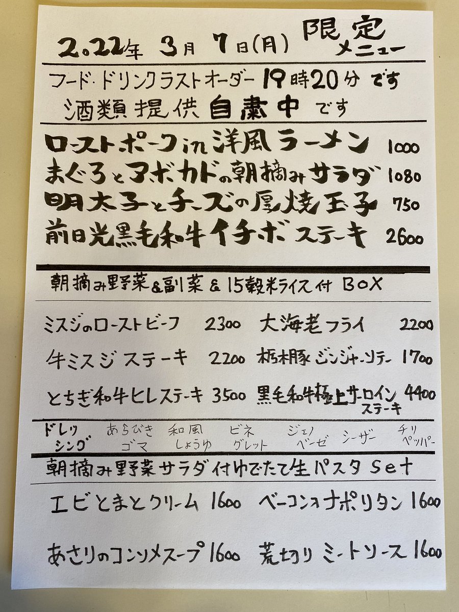 本日の限定 #テイクアウト メニューです。本日も #時短営業 19時20分 フードドリンクラストオーダー20時00分 クローズ...