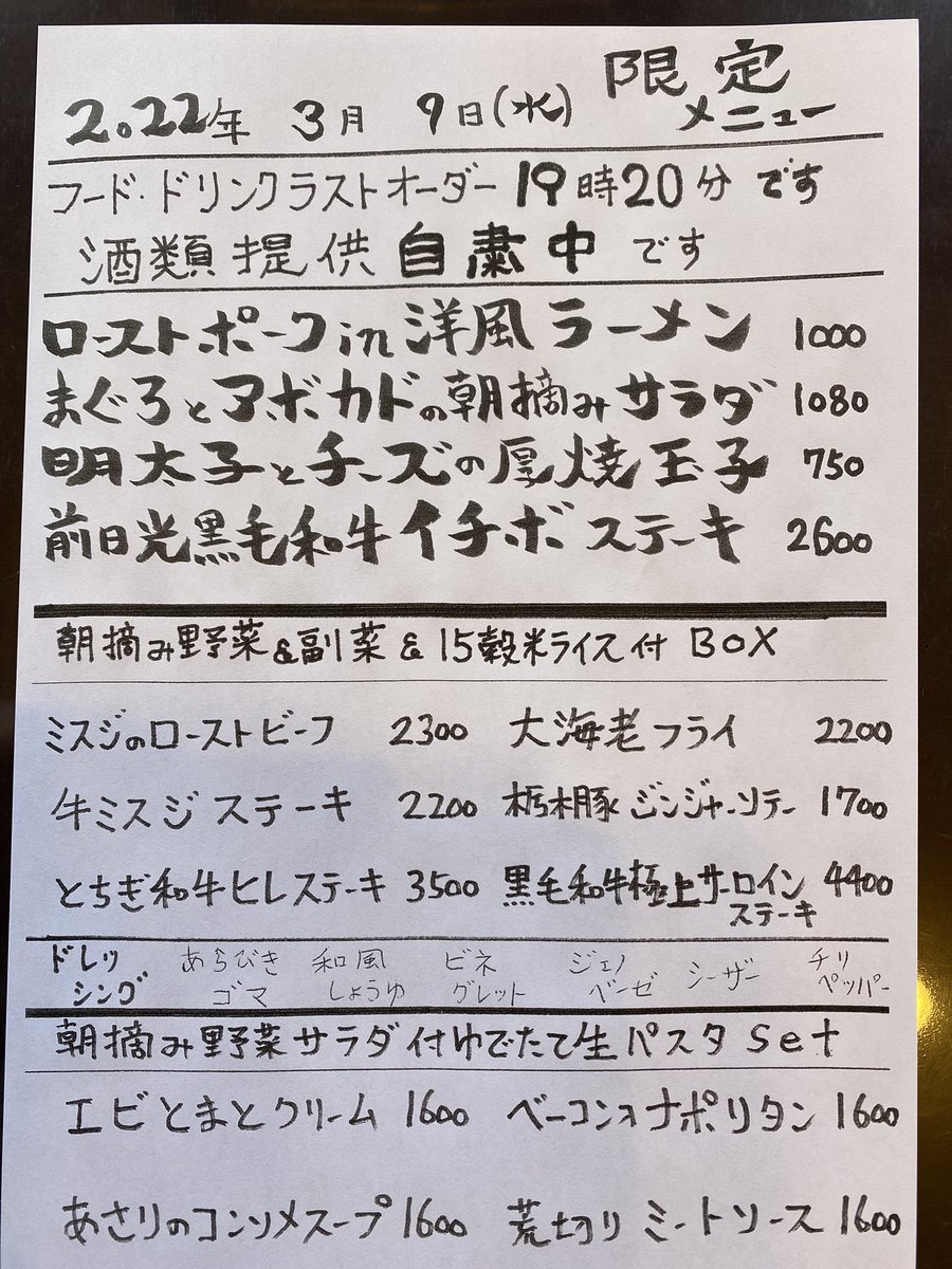 本日の限定 #テイクアウト メニューです。本日も #時短営業 19時20分 フードドリンクラストオーダー20時00分 クローズ...