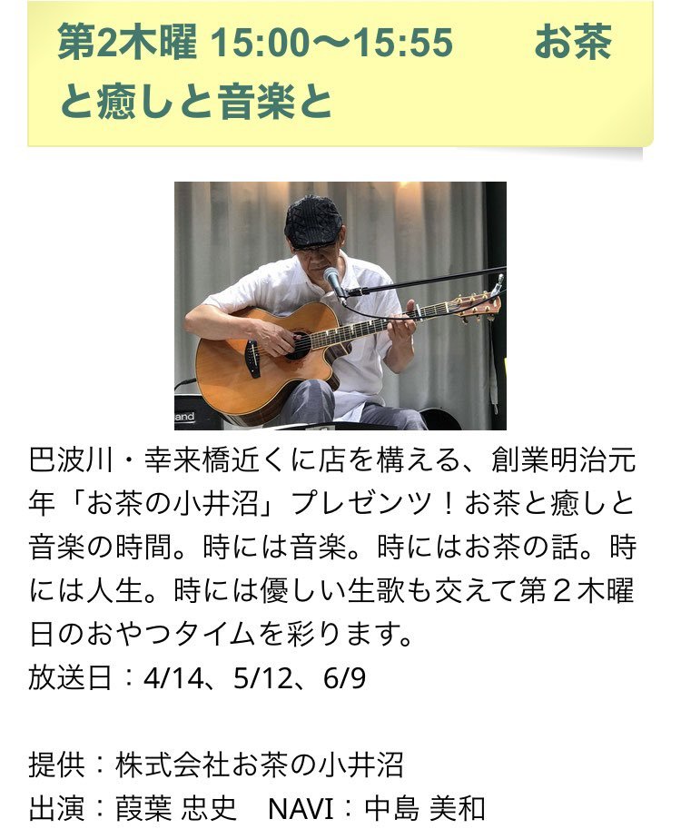 毎月第二木曜日の15時からは☺️『#お茶と癒しと音楽と』🍵♬ 今日は、#お茶の小井沼 の葭葉さんがお届けします🎙新茶の話もあります...