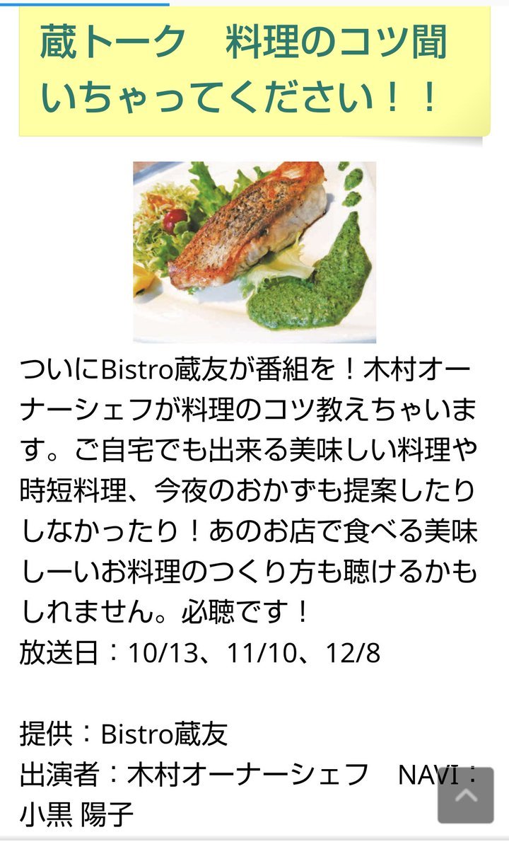 このあと9時からは、「#蔵トーク🎙料理のコツ聞いちゃってください!」お送りします!#Bistro蔵友 の木村オーナーシェフと、ナビゲ...