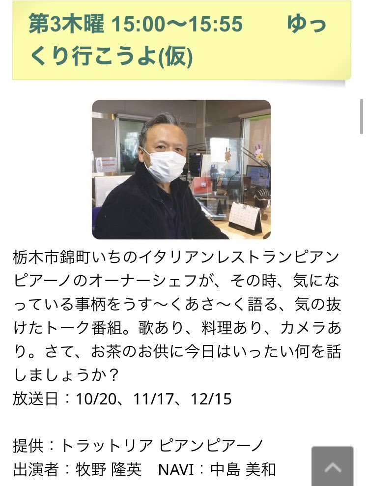このあと15時からは「#ゆっくり行こうよ(仮)」#トラットリアピアンピアーノ の提供で、オーナーの牧野さんとお送りしていきます🍝...