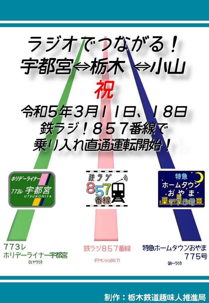 【鉄ラジ!857番線】本日18時から‼️今回は、栃木県内の鉄道ラジオ番組同士で初の相互乗り入れ🔄ゲストに #ミヤラジ 鉄道番組「773レ...