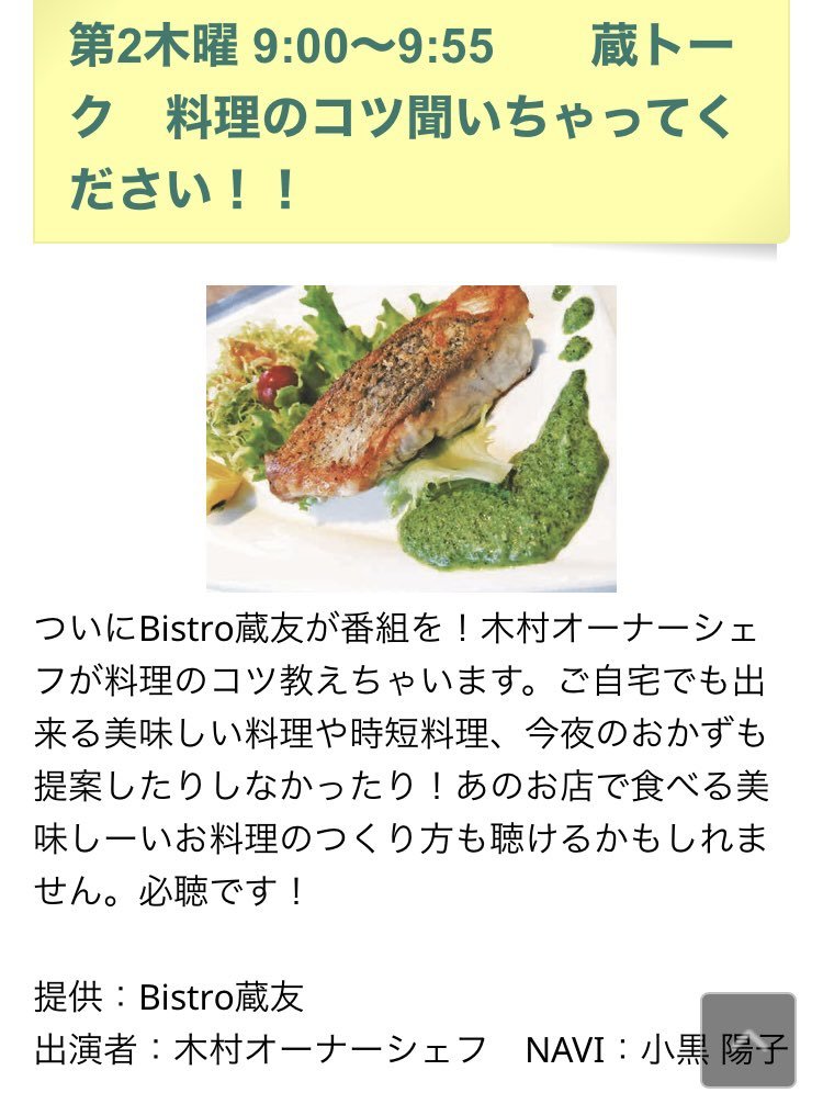 このあと9時からは、「#蔵トーク🎙料理のコツ聞いちゃってください!」スタートです✨#Bistro蔵友 の木村オーナーシェフと、ナビゲー...