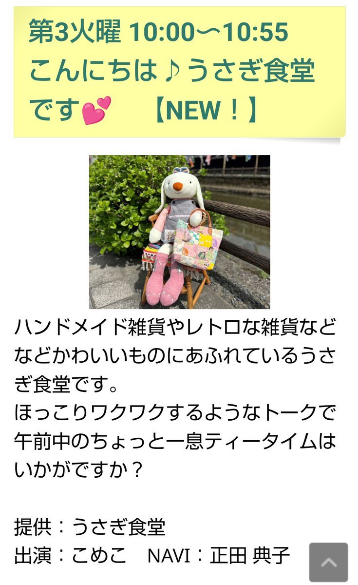 このあと10時から📻🎶新番組スタートです✨巴波川沿いの💕可愛い💕お店【#うさぎ食堂】から、【#こめこさん】をお迎えしてナビゲータ...