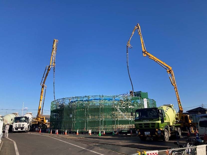 1ロット目のコンクリート打設です。2台のコンクリートポンプ車を使って、コンクリートを打設しました。