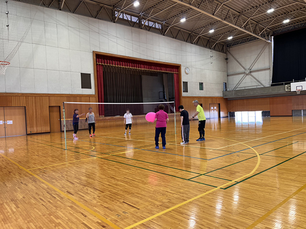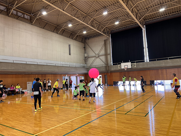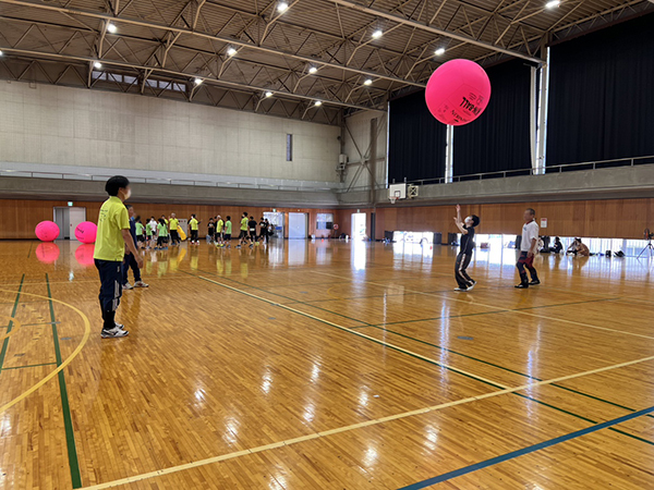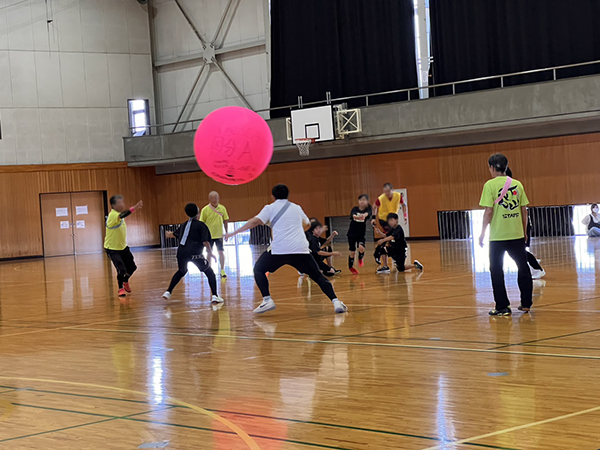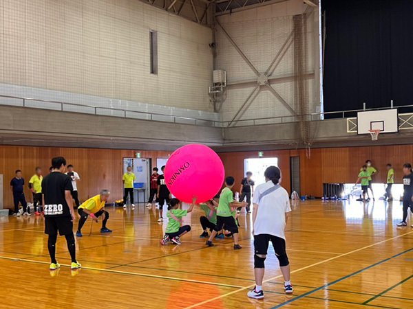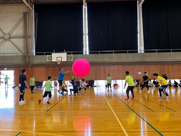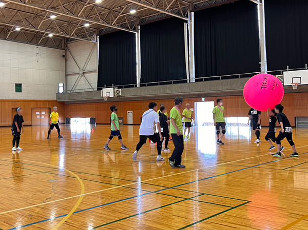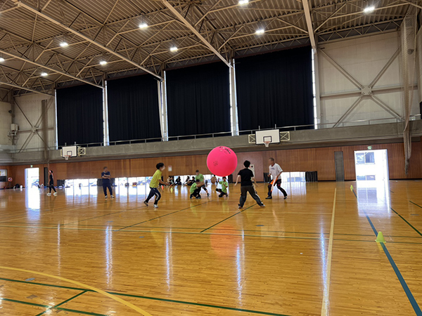大玉転がしぐらいの大きさのボールを使って、ボールを床に落とさないようにチームで協力するスポーツだよ!
