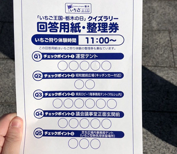 「いちご王国・栃木の日」クイズラリーに参加するといちご狩りを体験できるとのことなので、回答用紙をもらうため配布待ちの列に並びました。