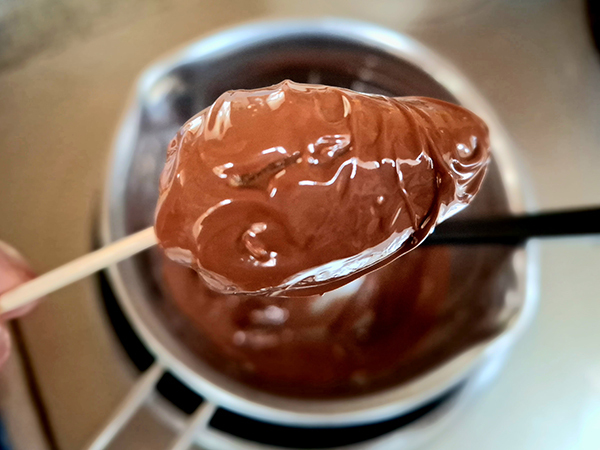 湯煎で溶かしたチョコをかけ、余分なチョコを切ってバットや皿にのせて乾かす。