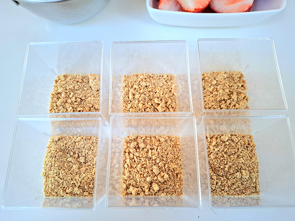 カップに砕いたクラッカーを大さじ1くらいずつ入れておく。