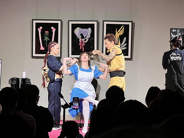 切るたびに形を変えていく髪と、紬をまとって舞うアリスの姿が並び立つその光景は、異なる表現が交差する“生のアート”そのものでした。