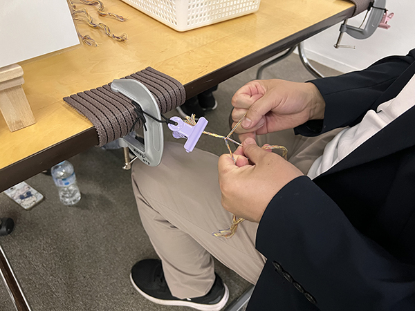 足で織り機を支え、自身の体重をかけながら糸を一本ずつ通していくその作業は、見た目以上に繊細で力強いもの。