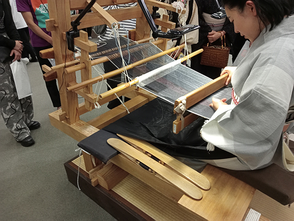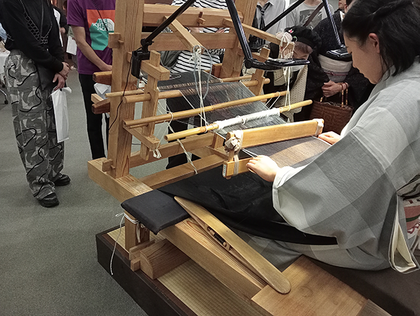 実演スペースでは、結城紬の伝統技法である「地機(じばた)織り」が披露されていました。