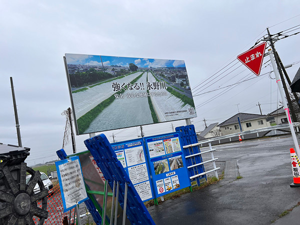 永豊橋のところに野川改良復旧工事等安全協議会工事の看板があります。