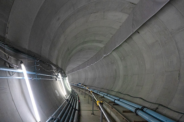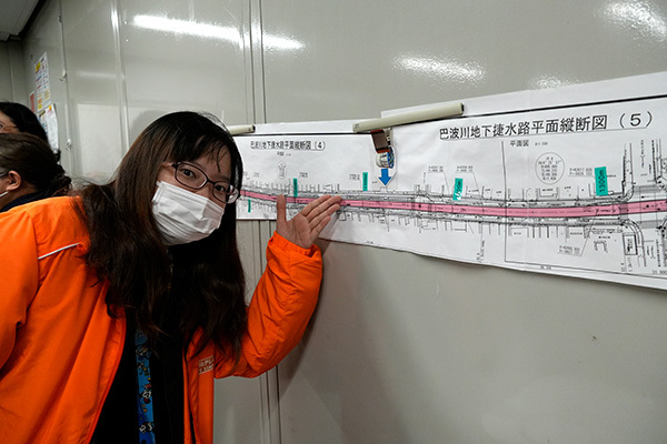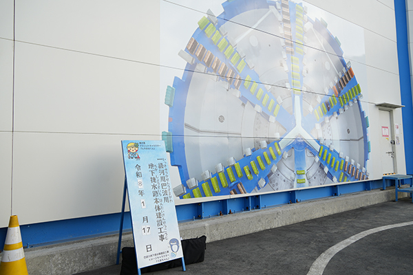 地下捷水路の壁には、直径6.16mにもなるシールドマシンの実物大写真が描かれており、これから始まる見学への期待が一気に高まります。
