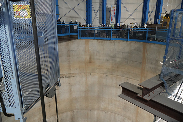 地下捷水路へと続く立坑を、見学者の皆さんが覗き込みます。