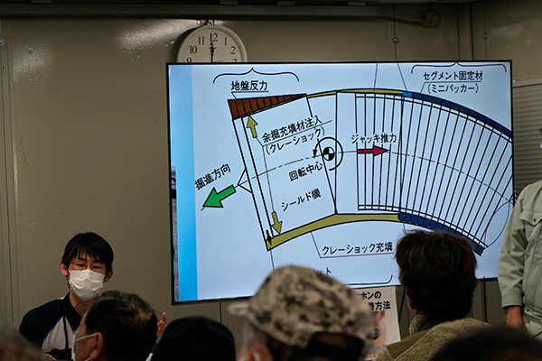 また、「直角に曲がっている部分は大変では?」という質問には、シールドマシン自体が曲がれる構造になっていること、さらにセグメントも場所に応じて幅を変えて作られていることが紹介されました。