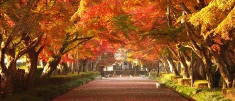 大山巌元帥墓所の参道に植えられた樹齢約100年のイロハカエデの並木が、見頃の時期には、色鮮やかなアーケードに変身。園内が真っ赤に染まる景色は必見!